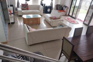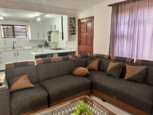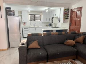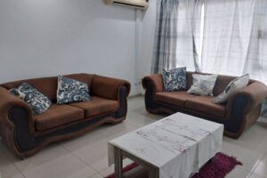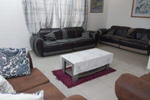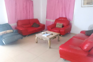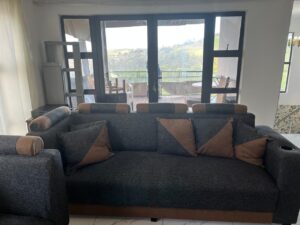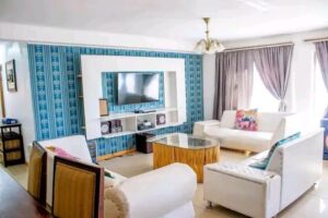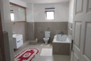 Has a King Bed, big built-in Wardrobe, spacious En Suite Bathroom (Shower, Bathtub, Toilet, Sink), Leather Couch, Coffee Table, TV (DSTV channels), Dressing Table, Heater, Fan, front Balcony access. Enjoy best view of the estate.