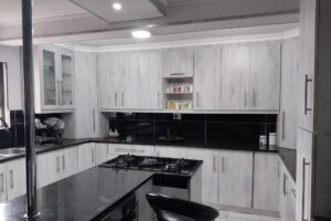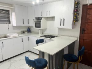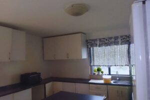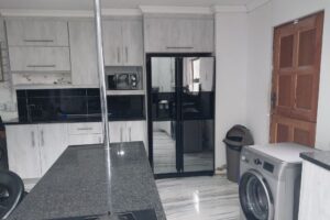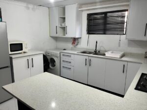 The kitchen has built-in cupboards (with eating utensils), double-door fridge, a microwave, gas stove, tumble dryer etc.