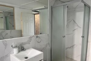 The communal bathroom has a bathtub, sink, toilet and a shower